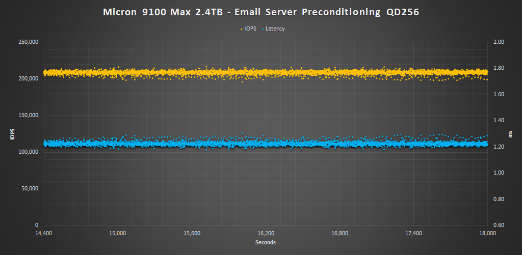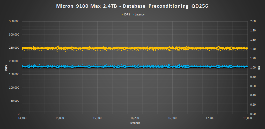 While synthetic 100% read or 100% write workloads do a great job of testing the underlying technology and reporting easy to understand results, they aren’t always indicative of how the drive will be used by the end user. Workloads that simulate enterprise environments try to bridge that gap without being overly complex. The process of measuring our server workload performance is the same as measuring random. The drive is first secure erased to get it in a clean state. Next, the drive is filled by sequentially writing to the RAW NAND capacity twice. We then precondition the drive with respective server workload at QD256 until the drive is in a steady state. Finally, we cycle through QD1-256 for 5 minutes each measuring performance. All this is scripted to run with no breaks in between. The last hour of our preconditioning, the average IOPS, and average latency for each QD is graphed below.