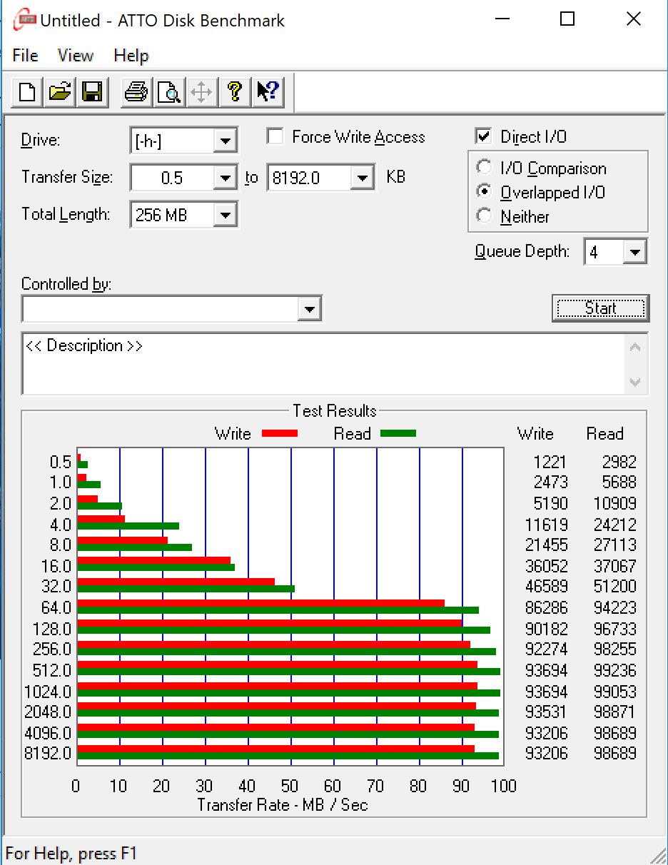 Performance progression is solid as sample sizes increase and 98MB/s read and 93MB/s write data transfer speeds are pretty close to the listed spec of 100MB/s read and 95MB/s write.