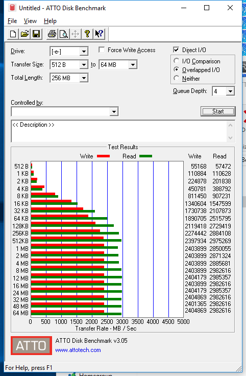 ATTO Disk Benchmark is perhaps one of the oldest benchmarks going and is definitely the main staple for manufacturer performance specifications. ATTO uses RAW or compressible data and, for our benchmarks, we use a set length of 256mb and test both the read and write performance of various transfer sizes ranging from 0.5 to 8192kb. Manufacturers prefer this method of testing as it deals with raw (compressible) data rather than random (includes incompressible data) which, although more realistic, results in lower performance results.