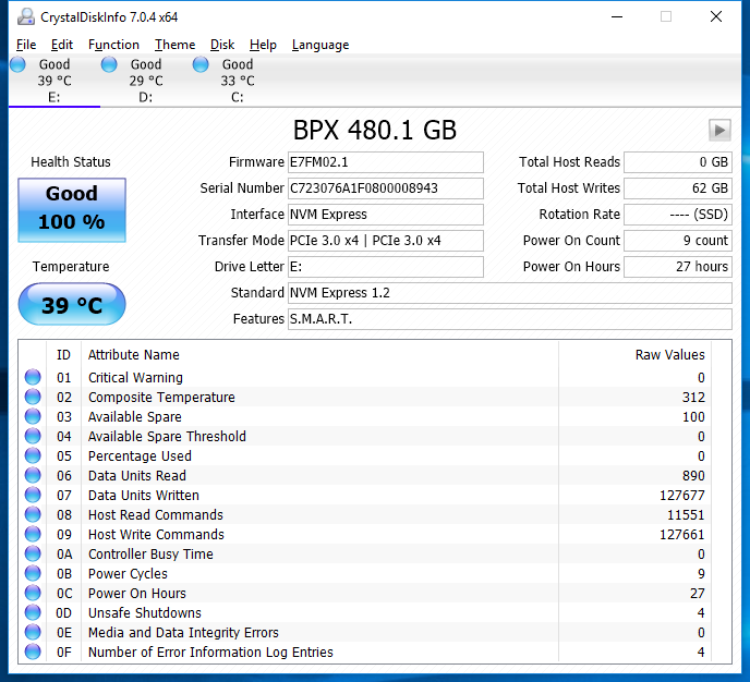Crystal Disk Info, shows us that SMART is supported. The BPX features a working temperature monitor, total host reads and writes attributes and more. The firmware we are testing today is E7FM02.1, which matches the same firmware we had on the Patriot Hellfire and Corsair Force MP500.