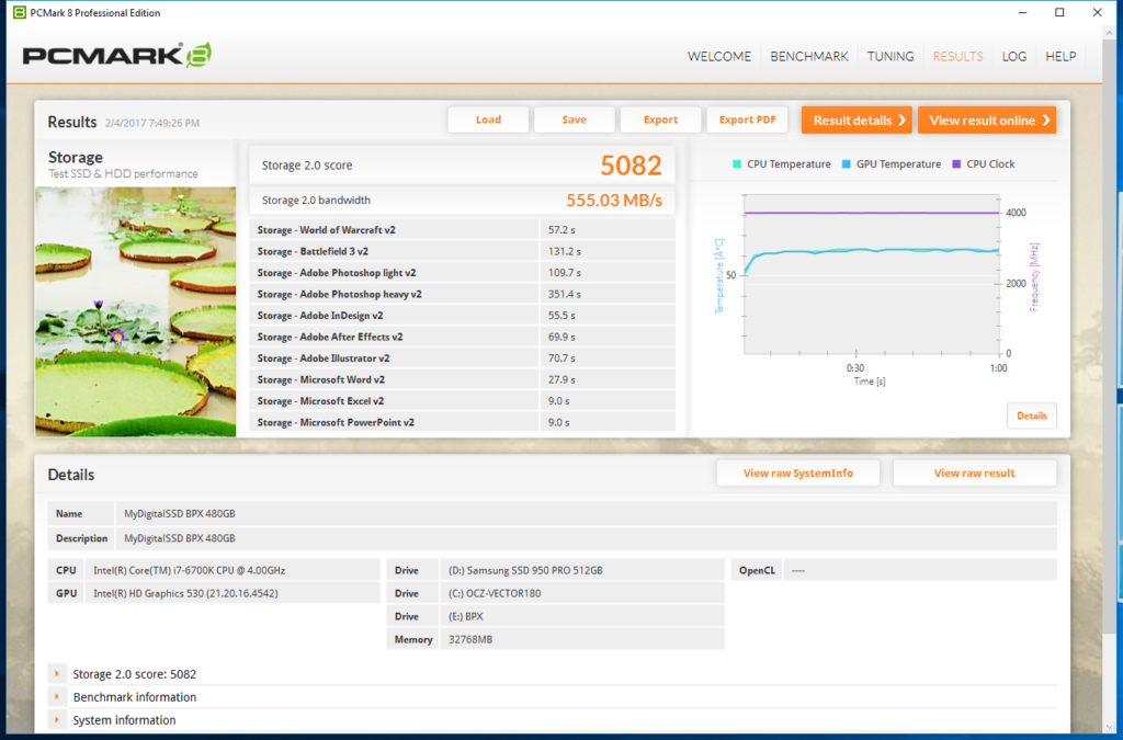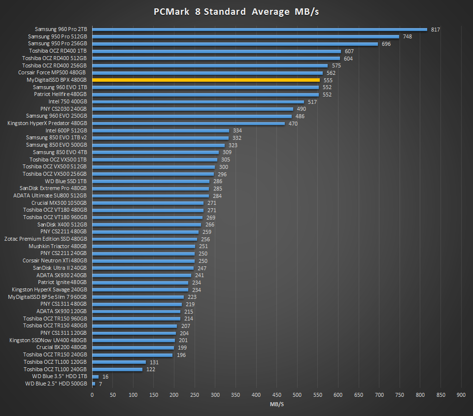 In PCMark 8 the MyDigitalSSD scored 5082 points and averaged 555.03MB/s in bandwidth.