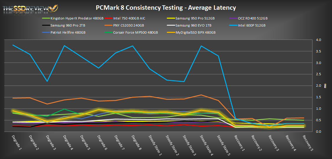 In reading the results, the Degrade and Steady State phases represent heavy workload testing while the recovery phase represents typical consumer light workload testing.