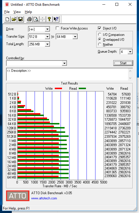 ATTO Disk Benchmark is perhaps one of the oldest benchmarks going and is definitely the main staple for manufacturer performance specifications. ATTO uses RAW or compressible data and, for our benchmarks, we use a set length of 256mb and test both the read and write performance of various transfer sizes ranging from 0.5 to 8192kb. Manufacturers prefer this method of testing as it deals with raw (compressible) data rather than random (includes incompressible data) which, although more realistic, results in lower performance results.