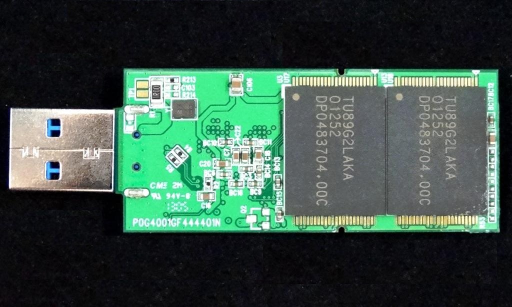 The MLC NAND modules specifically are the TU89G2LAKA Toggle-Mode chips made by Toshiba. Both the front and back of the PCB have two chips each, hence four in total. Each chip has a size of 64GB for an overall capacity of 256GB: