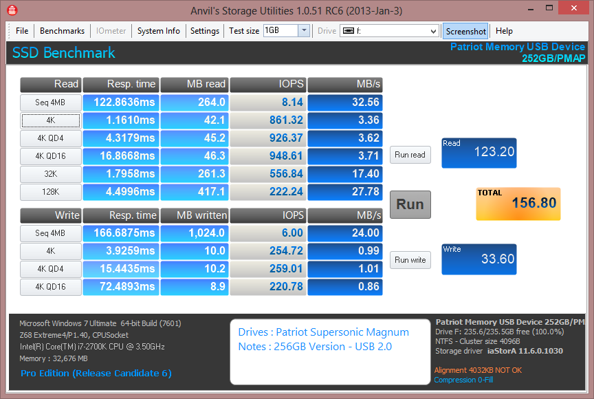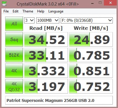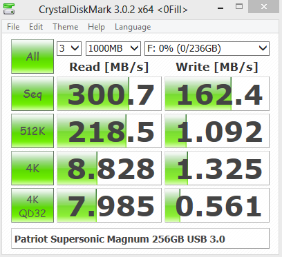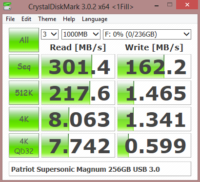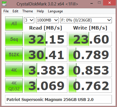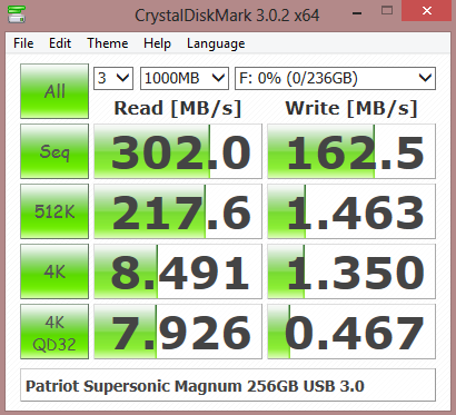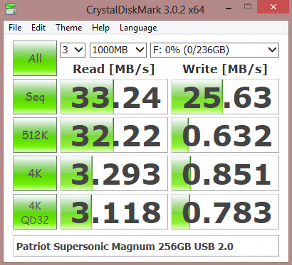 CDM confirms the Anvil findings. The 4K sequential read speeds are exceptional, whereas the writes are on the low side. Still not bad considering the Magnum is a flash drive, and certainly MUCH faster than any mechanical drive when comparing results. For one of the most popular – the Western Digital Caviar Black series – the Supersonic Magnum doubles its read speed and adds an extra 30% to the writes.