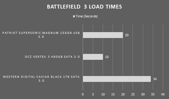 Battlefield 3 generally takes a while to load, but due to minimal modding servers are not ingested with random add-ons and plug-ins. It still takes the game a really long time to load on mechanical drives; for the Magnum on the other hand, it takes only half as long as the Vertex 3 – and remember that includes USB 3.0-USB3.0 communication overhead. Not too shabby at all!