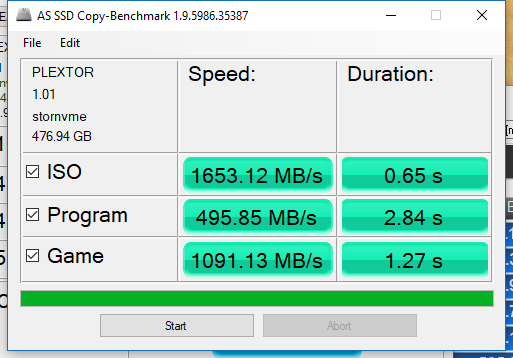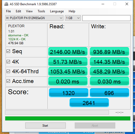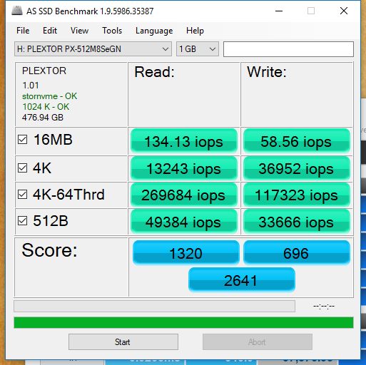 In our next benchmark, AS SSD, the Plextor M8Se was able to score 2641 points overall. The sequential performance came in at nearly 2.2GB/s for read and 936MB/s for write. 4KQD1 performance, again, is very good, but what is better is its higher QD IOPS performance. Here it reached nearly 270K IOPS read! This is much better than the rating of 210K IOPS, but the write result wasn’t quite as good at just 117K IOPS. During the copy test it averaged very good results with 1.6GB/s being the highest in the ISO test.