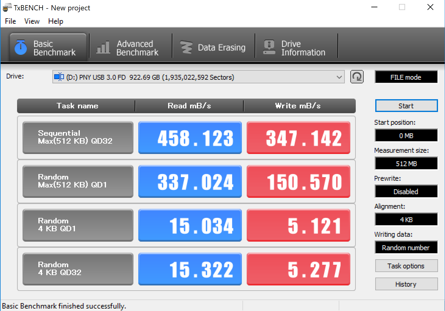 Considering that listed specifications for the PNY Pro-Elite are 400MB/s read and 250MB/s write, our results of 421MB/s read and 308MB/s write were very encouraging and were actually bettered by TxBench as you can see here: