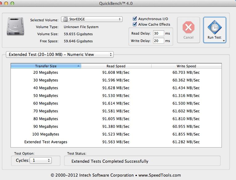 Looking at video performance of Disk Speed Test, we can see that the storEDGE was meant as a storage medium and not for media. Regardless, confirm,ation of such high transfer speeds is excellent.