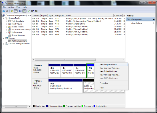 blankOnce the device is installed, you will configure the two partitions. Here under “Disk 1” in the disk management window you can see that you are presented with two separate partitions. The first is the speed of the SSD, but backed up onto the HDD as well. The second partition is the unused space that will be used as a storage space so that you can benefit from the excess capacity of the HDD. We simply configure the excess capacity into a New Simple Volume if we have already installed the operating system to the device. If the device is being used purely as storage and not a boot volume, then the user needs to create volumes on both partitions to access them.