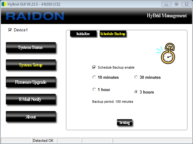 blankUnder the “System Setup” pane there is the option to configure the frequency of the data backups. The user can set time intervals, or simply uncheck the “Schedule Backup Enable” box. Doing so enters the device into Real Time Sync Mode.