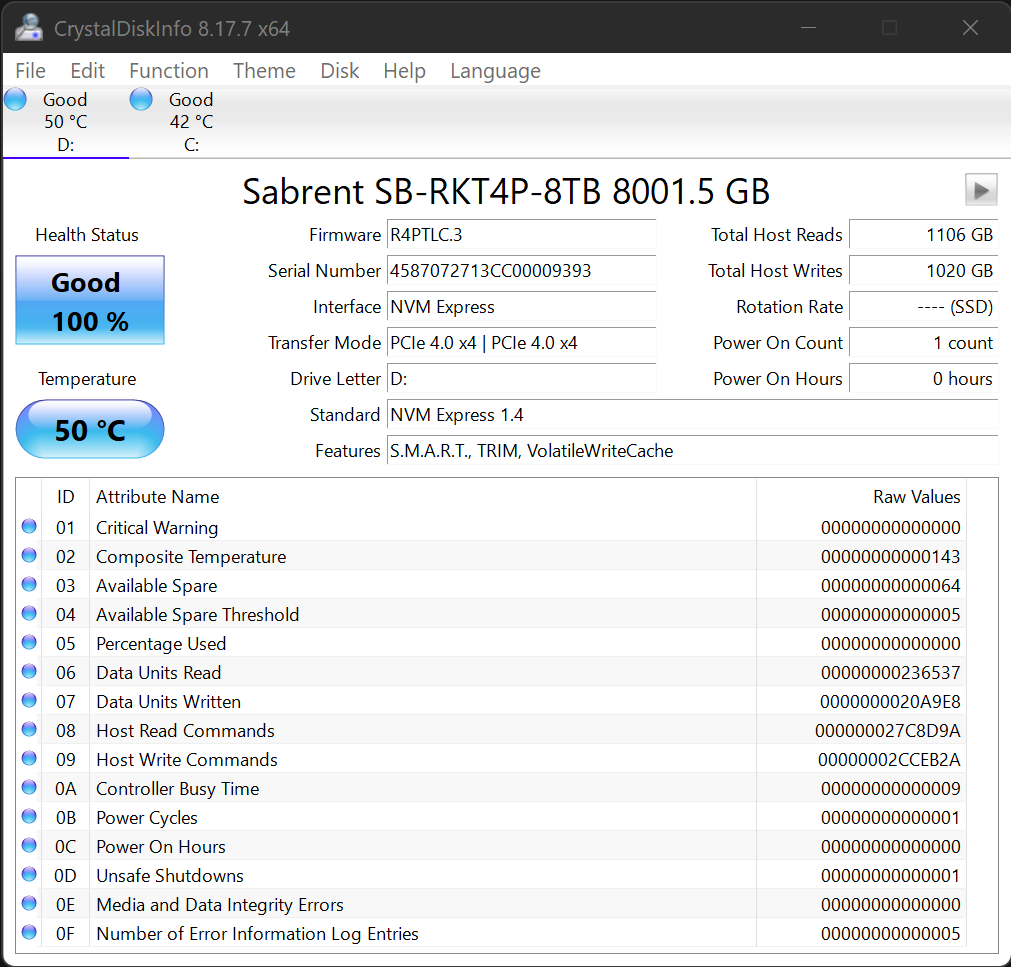 Crystal DiskInfo validates that our SSD is running in PCIe 4.0 x4, using the NVMe 1.4 protocol and confirms that it is TRIM capable.