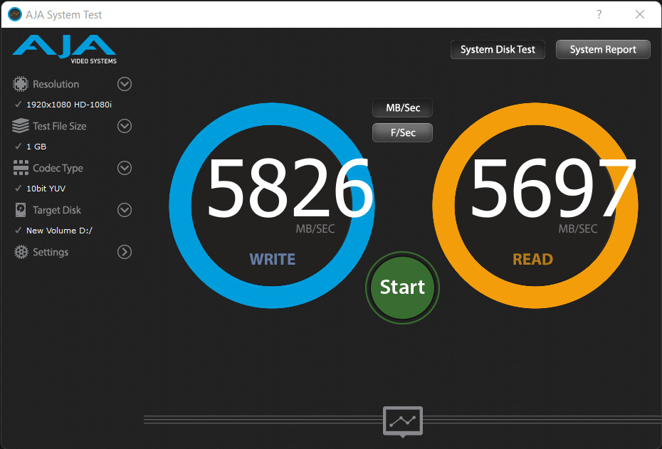 The AJA Video Systems Disk Test is relatively new to our testing and tests the transfer speed of video files with different resolutions and Codec.