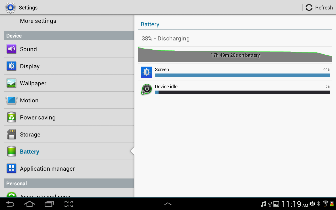 Battery life is excellent in the Galaxy Note 10.1. On average for a full lithium-ion charge, it will last for at least four days under moderate usage, which in my case encompassed watching the occasional online stream with WiFi and GPS on. Realistically, you can add a couple of extra days on top of the four to be more accurate. Keep in mind that GPS, WiFi, Bluetooth, and the S Pen also drain battery life when not in use: