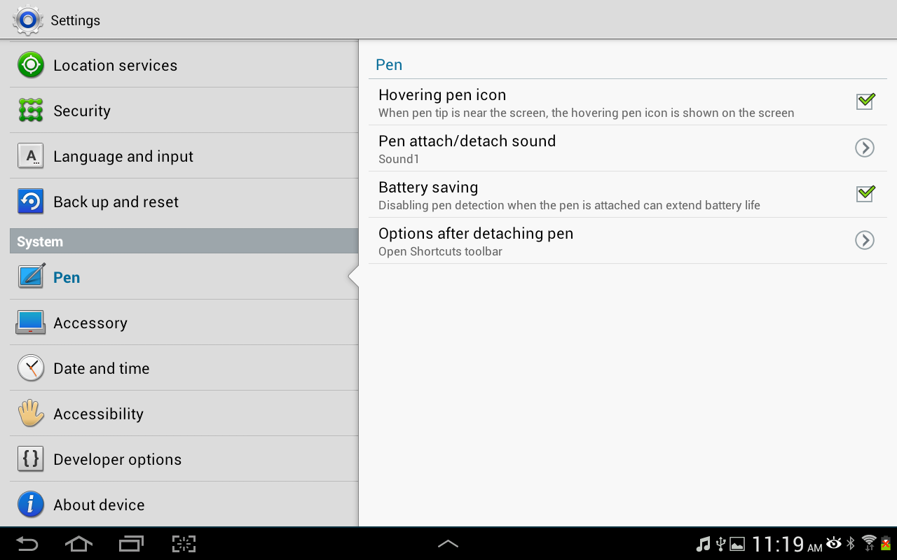 I have been mentioning them, but here are the settings. Typically, you have the tabs on the left and the modification pane on the right. Note that the 16GB version of the Samsung Galaxy Note 10.1 was used for the review.