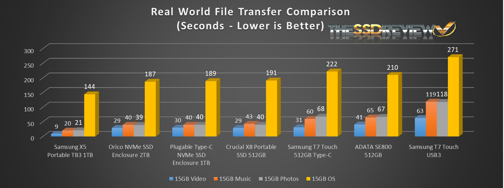 In looking at these results, we can see that the Samsung X5 TB3 Portable SSD is way ahead, much as expected. Right behind that are the Orico and Plugable Portable SSDs that use the JMicron controller followed by Crucial, Samsung and ADATA which use the ASMedia controller. Lastly, using the Samsung T7 with the USB 3 adapter is significantly slower than we see with USB 3.2 Gen 2.