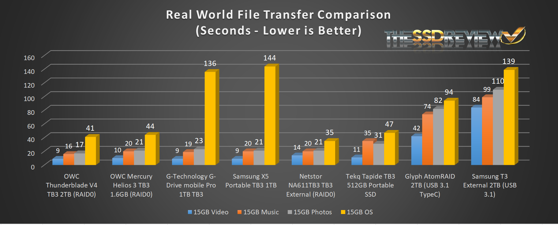 For our Real World File Transfer Comparison, we have included the OWC Thunderblade V4 TB3 RAID0 Chassis, Mercury Helios 3 PCIe TB3 Chassis, Netstor NA611TB3, TEKq Rapide 512GB TB3, Glyph USB 3.1 2TB Atom RAID external SSD, and Samsung T3 in our testing with the Samsung X5 TB3 1TB Portable SSD. This test is conducted through the transfer of data from one spot on the test drive to another to give us the truest of transfer speed results for that device.