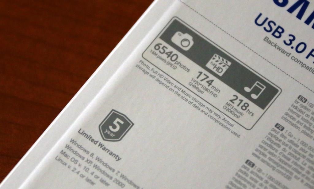 Another clever marketing inclusion is Samsung’s mentioning what the drive is capable of storing, in this case for the 32 version being 6540 photos, 174 minutes of HD video or 218 hours of music.
