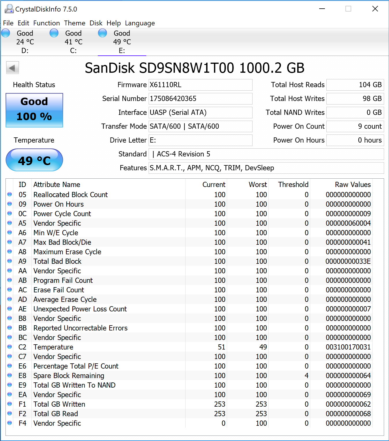 Crystal Disk Info is a great tool for displaying the characteristics and health of storage devices. It displays everything from temperatures, the number of hours the device has been powered, and even to the extent of informing you of the firmware of the device.