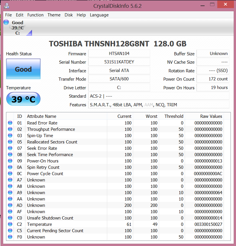 Crystal Disk Info provides some excellent information about the SSD itself to include its health, product information, ‘power on’ information as well as the characteristics of the SSD. We can see that the SSD is capable of TRIM as it is not grayed out as with AAM.