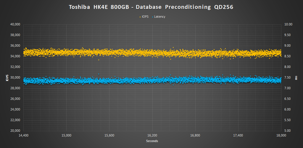 While synthetic 100% read or 100% write workloads do a great job of testing the underlying technology and reporting easy to understand results, they aren’t always indicative of how the drive will be used by the end user. Workloads that simulate enterprise environments try to bridge that gap without being overly complex. The process of measuring our server workload performance is the same as measuring random. The drive is first secure erased to get it in a clean state. Next, the drive is filled by sequentially writing to the RAW NAND capacity twice. We then precondition the drive with respective server workload at QD256 until the drive is in a steady state. Finally, we cycle through QD1-256 for 5 minutes each measuring performance. All this is scripted to run with no breaks in between. The last hour of our preconditioning, the average IOPS, and average latency for each QD is graphed below.