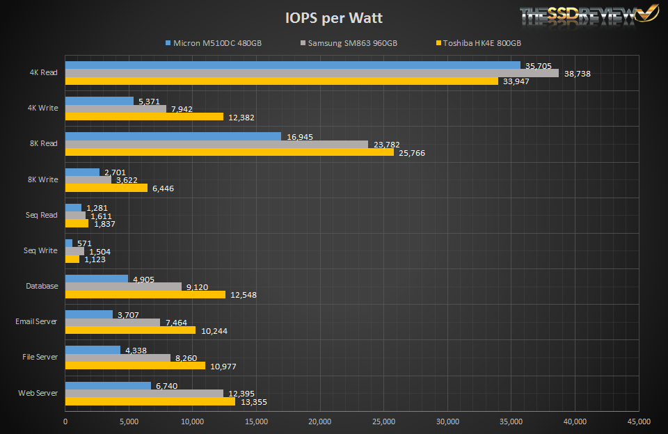Now, looking at the IOPS per Watt under workloads we can see that the HK4E is again, extremely efficient. In almost every test, except for 4K read and sequential write, the HK4E is more efficient than the rest of the pool! The Micron 510DC doesn’t stand a chance here, except in pure 4K read where it also surpasses the HK4E.