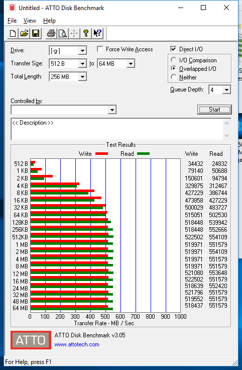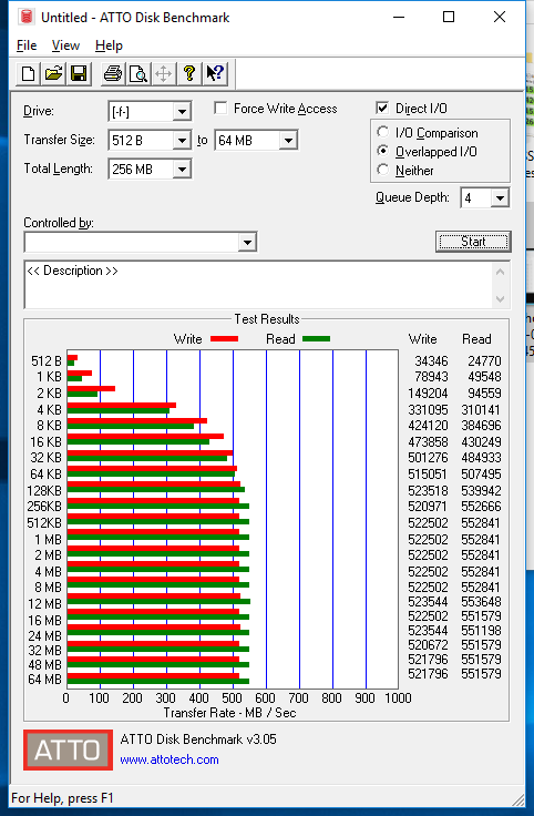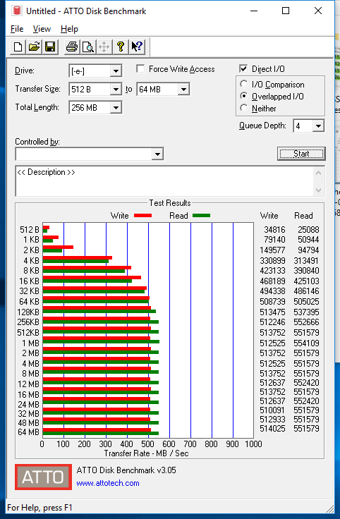 ATTO Disk Benchmark is perhaps one of the oldest benchmarks going and is definitely the main staple for manufacturer performance specifications. ATTO uses RAW or compressible data and, for our benchmarks, we use a set length of 256mb and test both the read and write performance of various transfer sizes ranging from 0.5 to 8192kb. Manufacturers prefer this method of testing as it deals with raw (compressible) data rather than random (includes incompressible data) which, although more realistic, results in lower performance results.