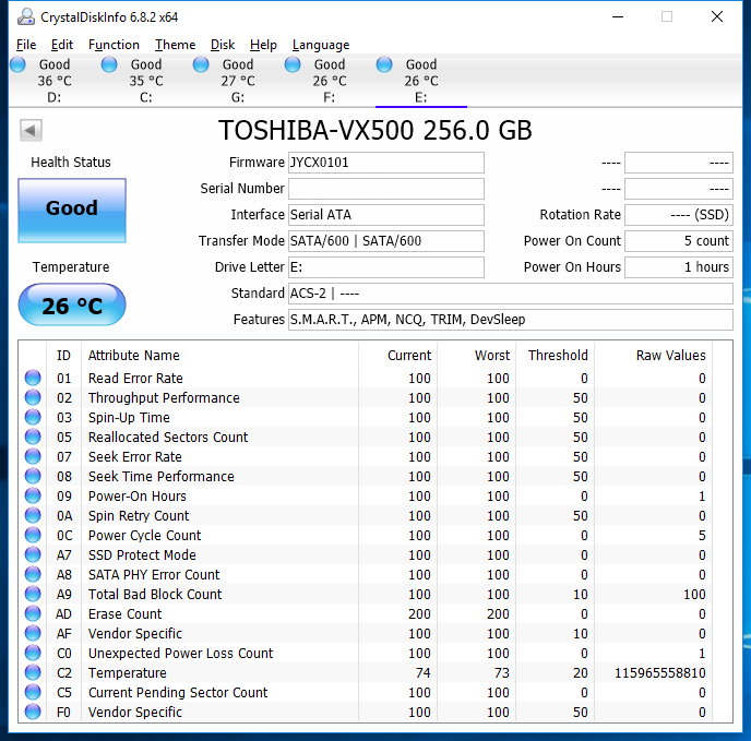 Crystal Disk Info reveals the VX500’s SMART support and confirms that it supports NCQ, TRIM, and DevSleep as well. Additionally, we can see that the firmware being tested on is JYCX0101. The VX500 also has a temperature sensor that works, but no total writes counter.