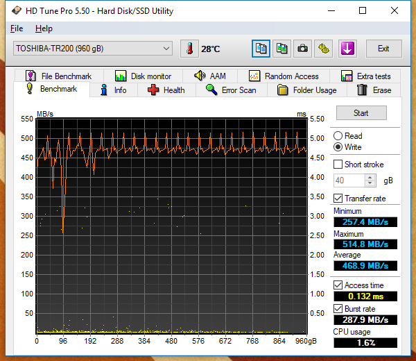 HD Tune is a Hard Disk Utility with many functions from error checking, health testing (S.M.A.R.T.), and of course benchmarking. To build upon our real world write test we also looked to see where the write speeds leveled off to by using HD Tune Pro. If SLC caching is being utilized, this test will typically show it.