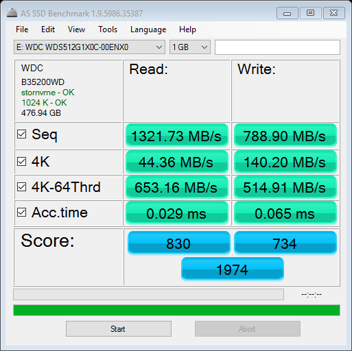 AS SSD’s results are a bit lower than the other test results, but this is normal for us to see in testing. The WD Black PCIe achieved an overall score of 1974 points and reached 1.3GB/s read and 788MB/s write performance. At 4K QD1 its results were decent, but not as good as many of the PCIe SSDs we have seen. Looking at the IOPS performance, we see that it achieved 167K/131K, which is very close to its rated 170K/134K ratings. Finally, the Copy test shows all speeds above SATA’s potential as we expected.