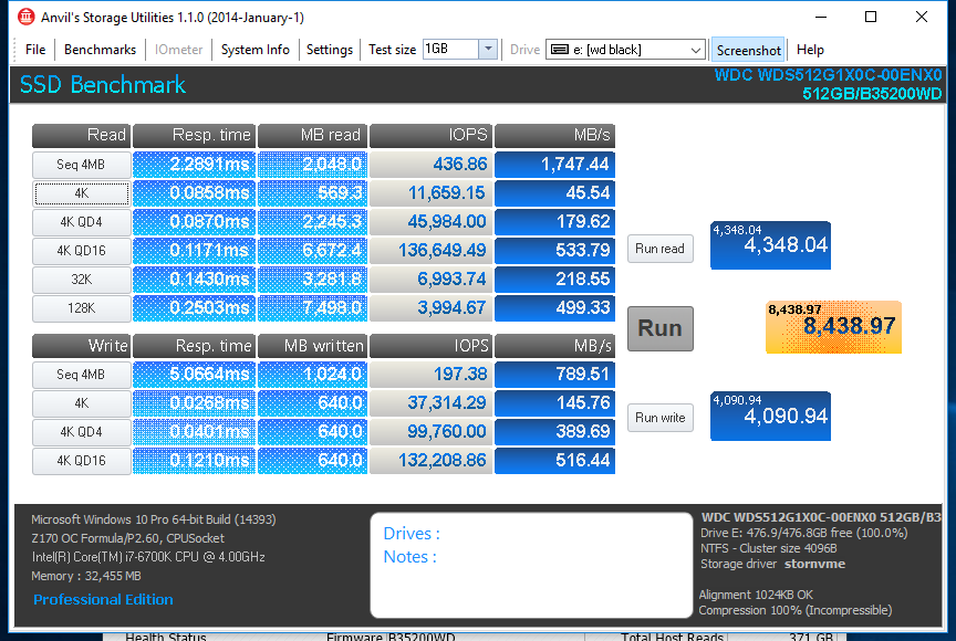 In Anvil Storage Utilities, we can see that the WD Black PCIe delivered an overall score of 8.4K points. This result is fairly good and better than what any SATA based SSD could achieve. Sequential and 4K speeds show to be in between that of AS SSD and Crystal Disk Mark with read reaching 1.7GB/s and write at nearly 800MB/s.