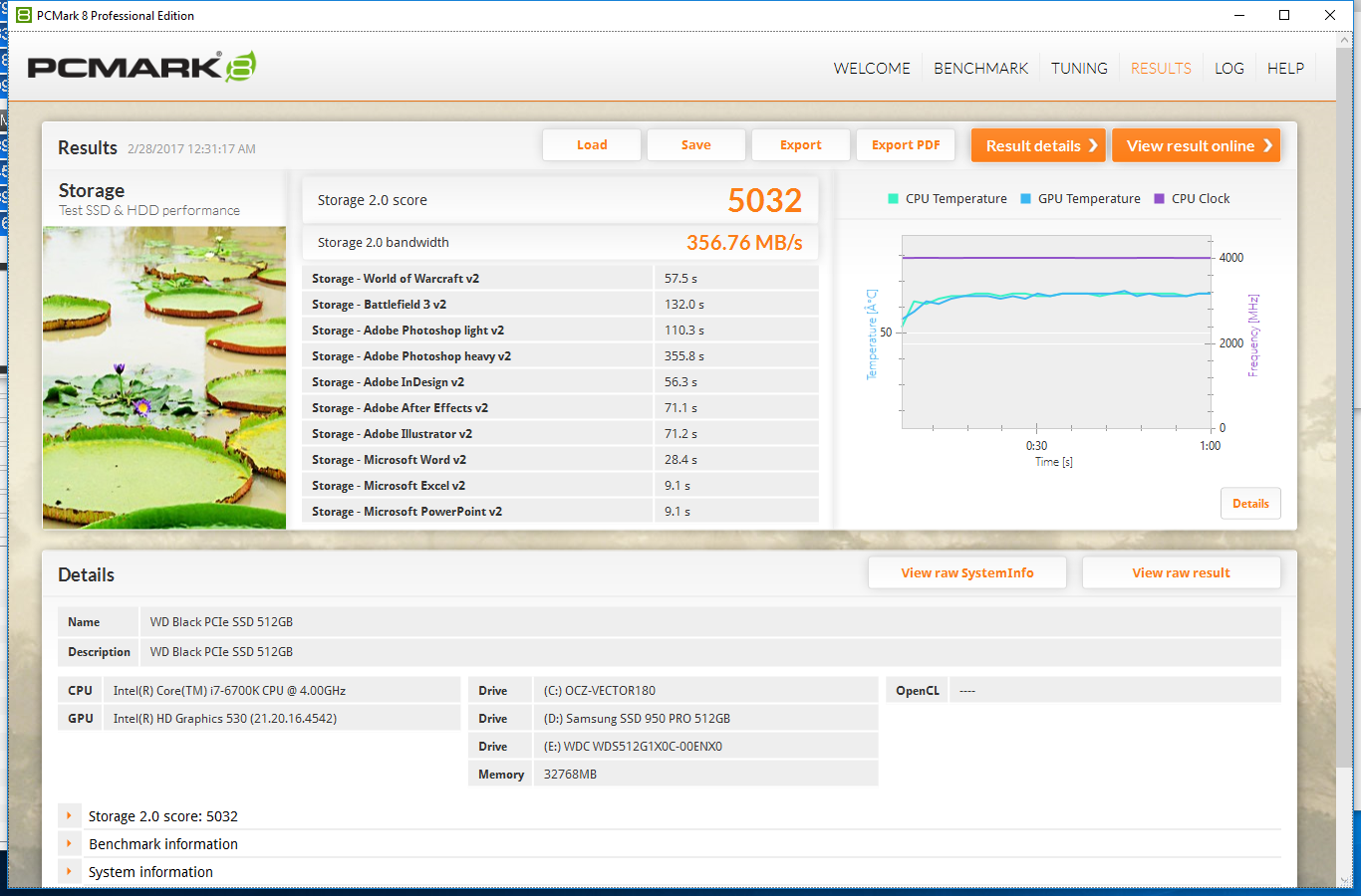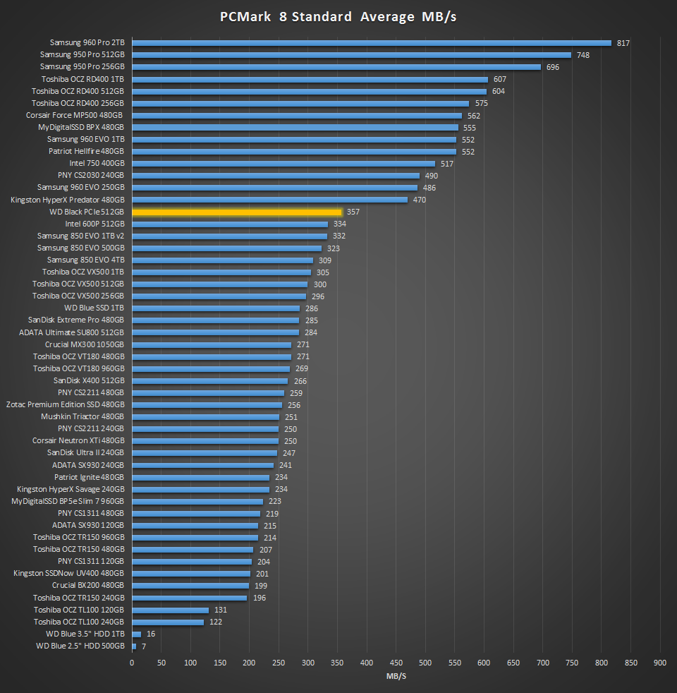 In PCMark 8 the WD Black PCIe scored 5032 points and averaged 356.76MB/s in bandwidth.
