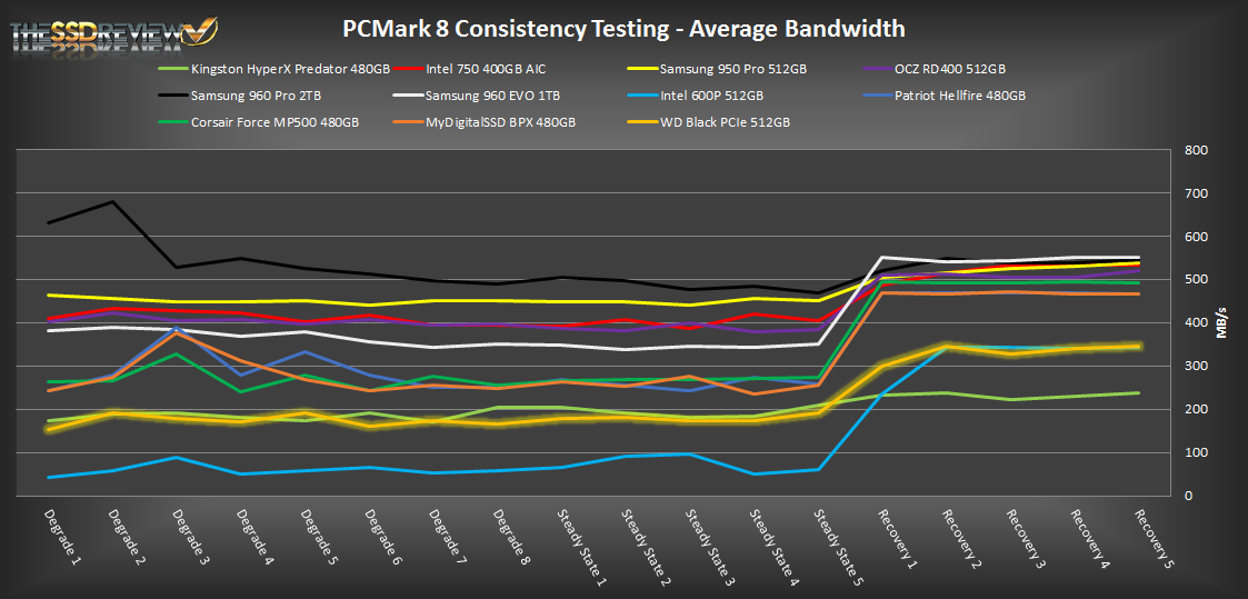 After many grueling rounds of testing in PCMark 8’s consistency test, we can see that its performance profile shows to be much better than the Intel 600P’s during heavy workload uses cases. During the recovery section the Intel 600P proved to be a worthy adversary and both drives average in the mid-300s for bandwidth, but looking at overall performance, we have to give it to the WD Black PCIe. Its consistency profile is more similar to the rest of the PCIe options we have tested thus far and its latency is better regulated.