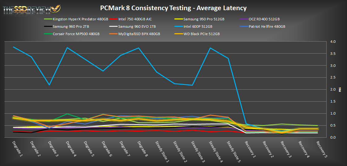 In reading the results, the Degrade and Steady State phases represent heavy workload testing while the recovery phase represents typical consumer light workload testing.
