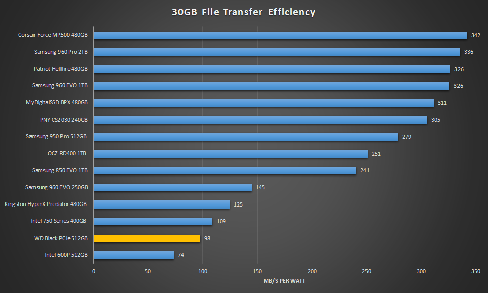 Here the WD Black PCIe SSD comes very close in performance to the 250GB Samsung 960 EVO and easily beats the 512GB Intel 600P. Still, the SATA based Samsung 850 EVO out-performs it. The SLC caching just isn’t large enough to cope with such a large transfer.