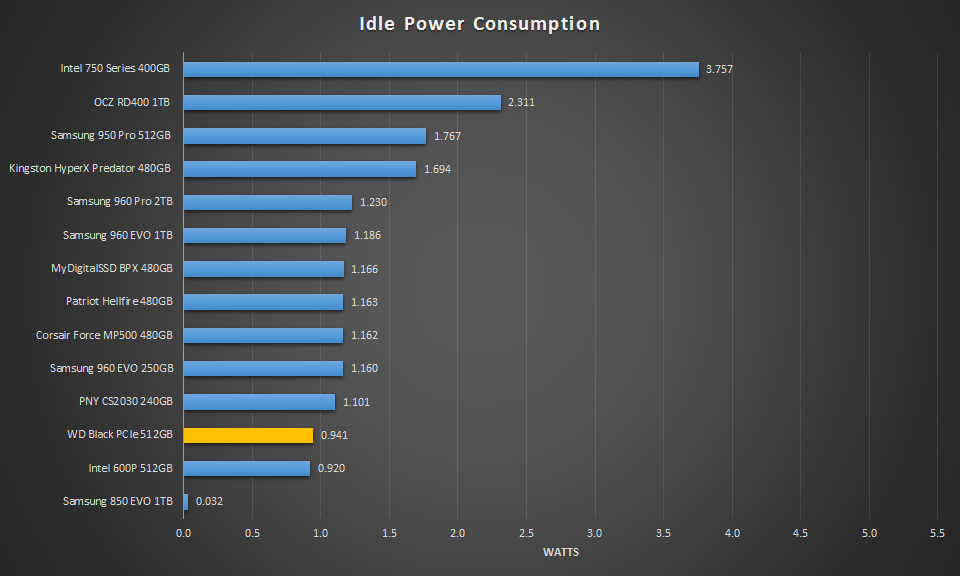 During idle, the WD Black PCIe nearly matches the Intel 600P here. It consumes under 1W, which is better than all the other PCIe SSDs we have tested. This, compared to SATA though, is still much higher.