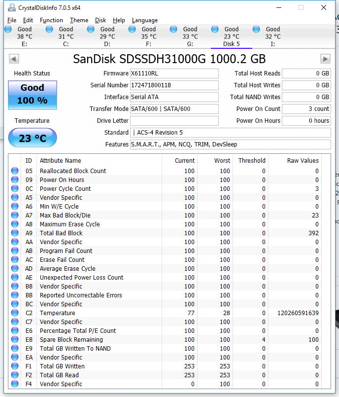 Crystal Disk Info is a great tool for displaying the characteristics and health of storage devices. It displays everything from temperatures, the number of hours the device has been powered, and even to the extent of informing you of the firmware of the device.