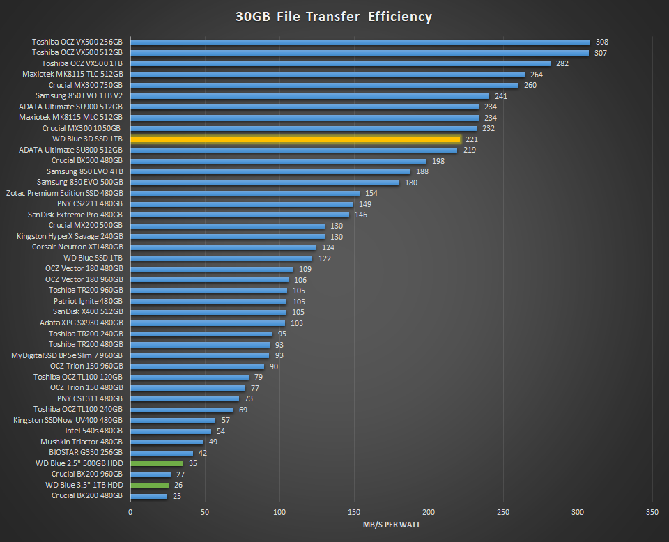 In the chart above shows us that the WD Blue 3D SSD is very efficient. WD actually states that this new model is 25% more efficient. Looking at the results, it may not be the highest on the chart, but it is ahead of many other mainstream SSDs. We can see that its write efficiency has improved dramatically from its predecessor, just as WD states. The previous WD Blue 3D SSD only delivered 122MB/s per watt. The new 3D NAND model is capable of delivering 100MB/s more per watt! That’s an 81% increase in efficiency! Well done!