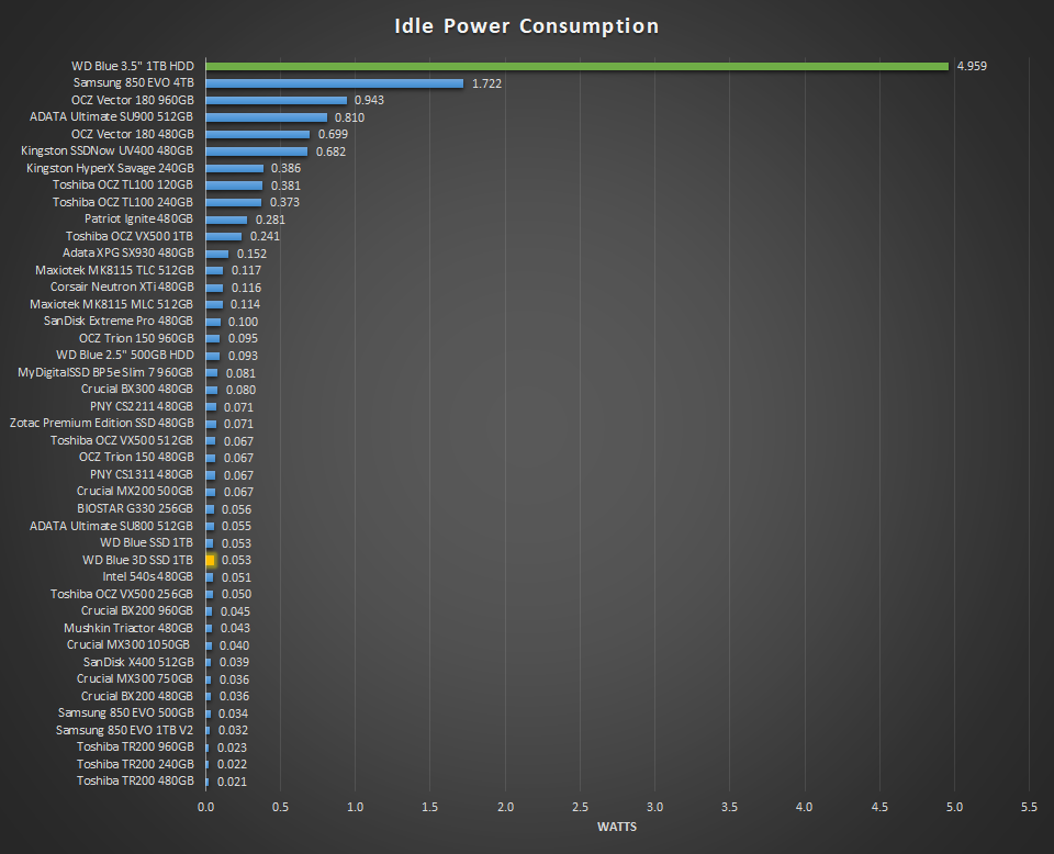 In the chart above we can see that SSDs are magnitudes more efficient than standard HDDs. WD rates the WD Blue 3D SSD’s idle at 52-60mW. At 0.053W (52mW) the WD Blue 3D SSD’s idle power consumption matches that rating as well as its predecessor.