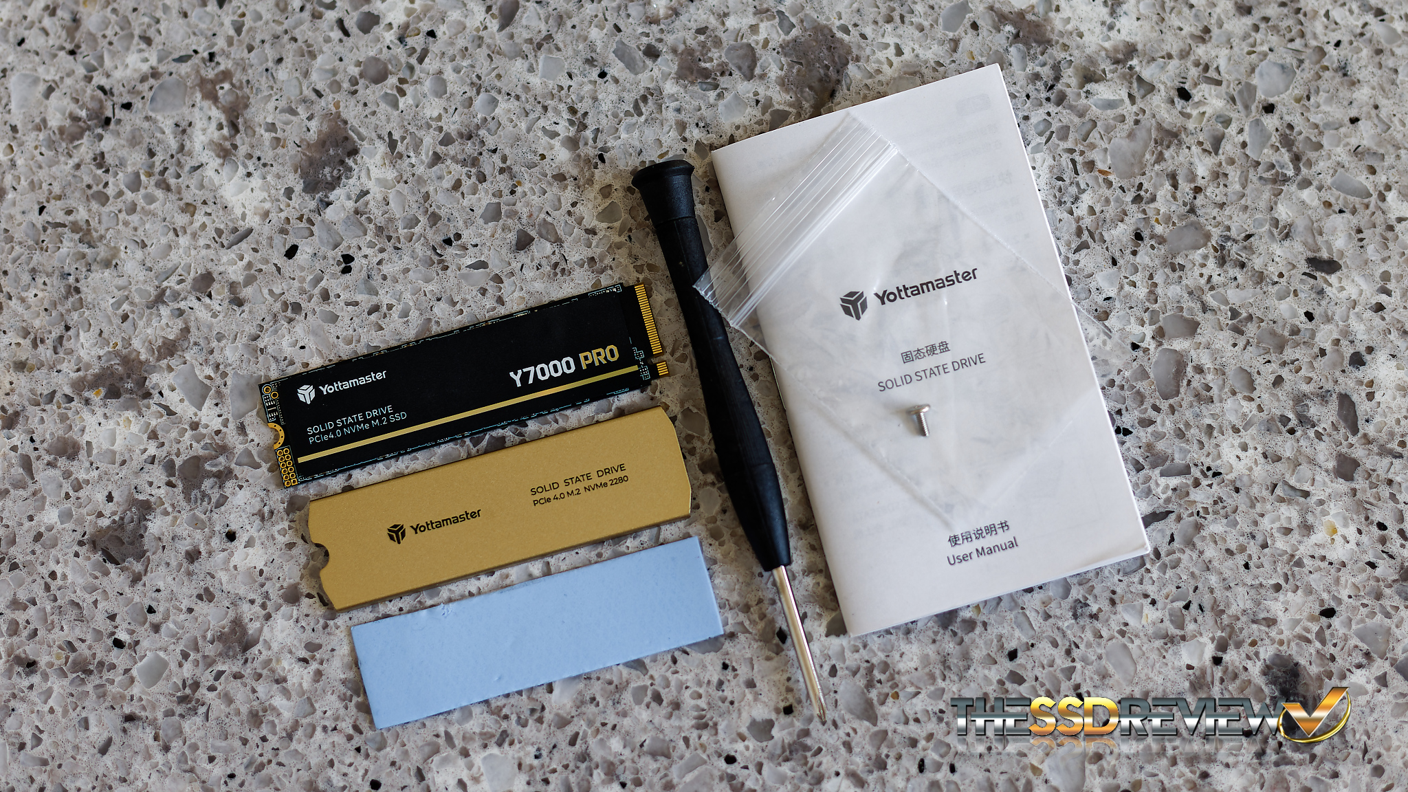 Included in our packaging was the external box, a user manual, the Y7000 Pro 4TB SSD, a screwdriver, screw and what appears to be a heatsink base and one piece of silicone thermal pad. This differs from their website description as shown here.