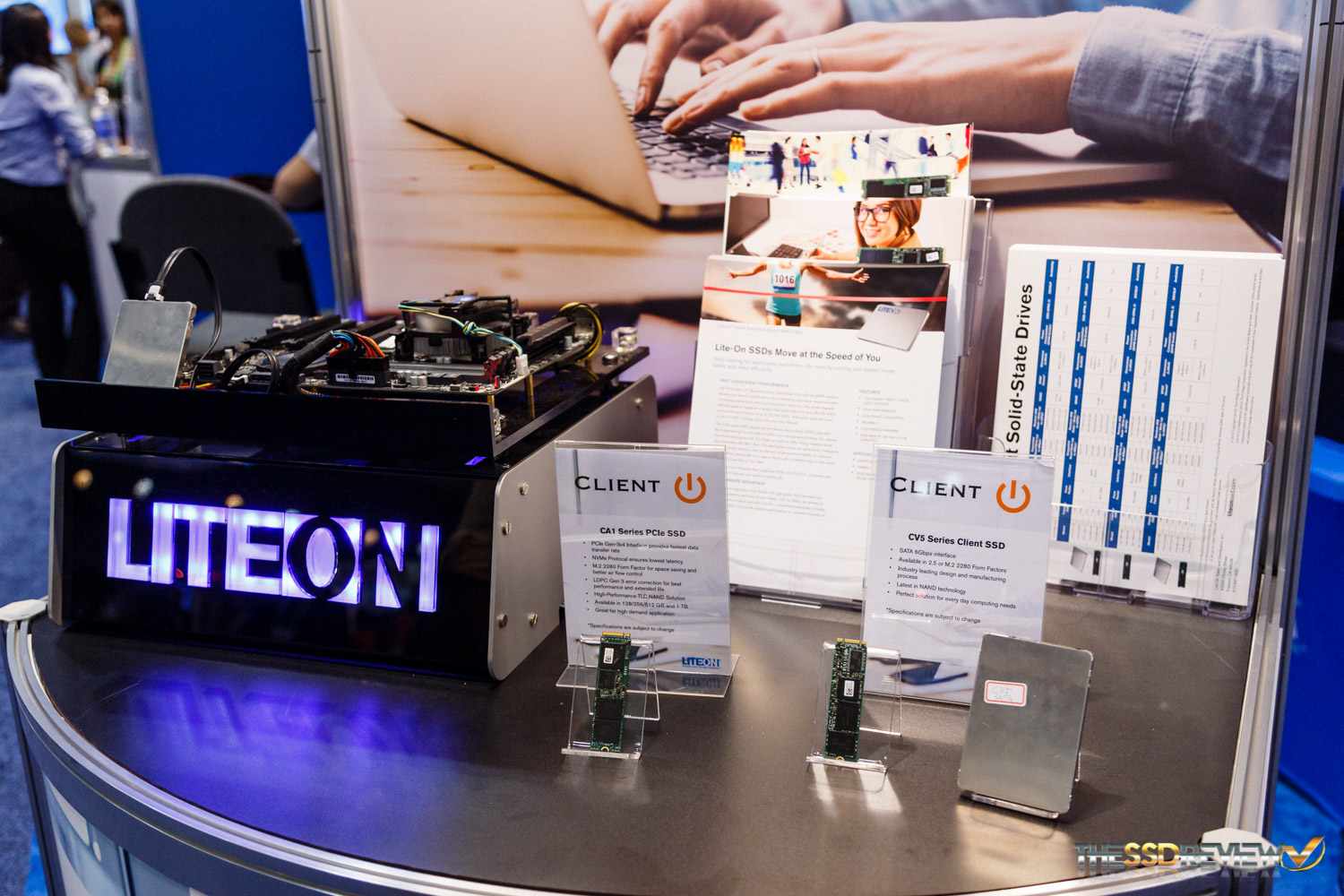 In addition to their enterprise brand, LiteOn, they also had on display some products from their consumer brand, Plextor. Obviously there is the PX-M8e. There are three sku’s as can be seen. There are two M.2 only models, one with and one without a heatsink as well as a model, utilizing a M.2 to PCIe HHHL adapter card. The M8e is now rated for up to 2.5GB/s read and 1.4GB/s write as well as up to 280K/240K IOPS read/write. It will be available in capacities up to 1TB and we will be reviewing it as soon as we get one in our hands!