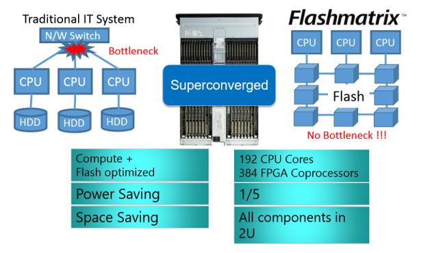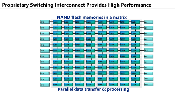 This new type of Superconverged infrastructure provides integrated compute, network elements and storage, all optimized for high performance. Utilizing a unique architecture with NAND flash chips arranged in a matrix, Flashmatrix allows multiple data sets to be accessed in parallel, as well as linear scaling. ALL available NAND flash memory is shared by all CPUs, creating high performance and flexibility. The entire platform is encased in a 2U enclosure, which allows for linear rack scale scalability. Flashmatrix is optimized for low power consumption.