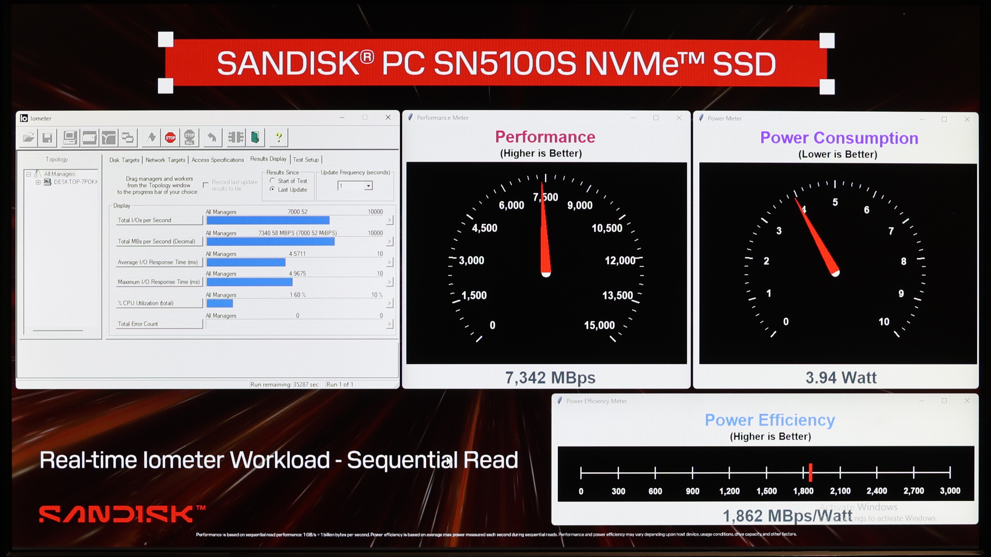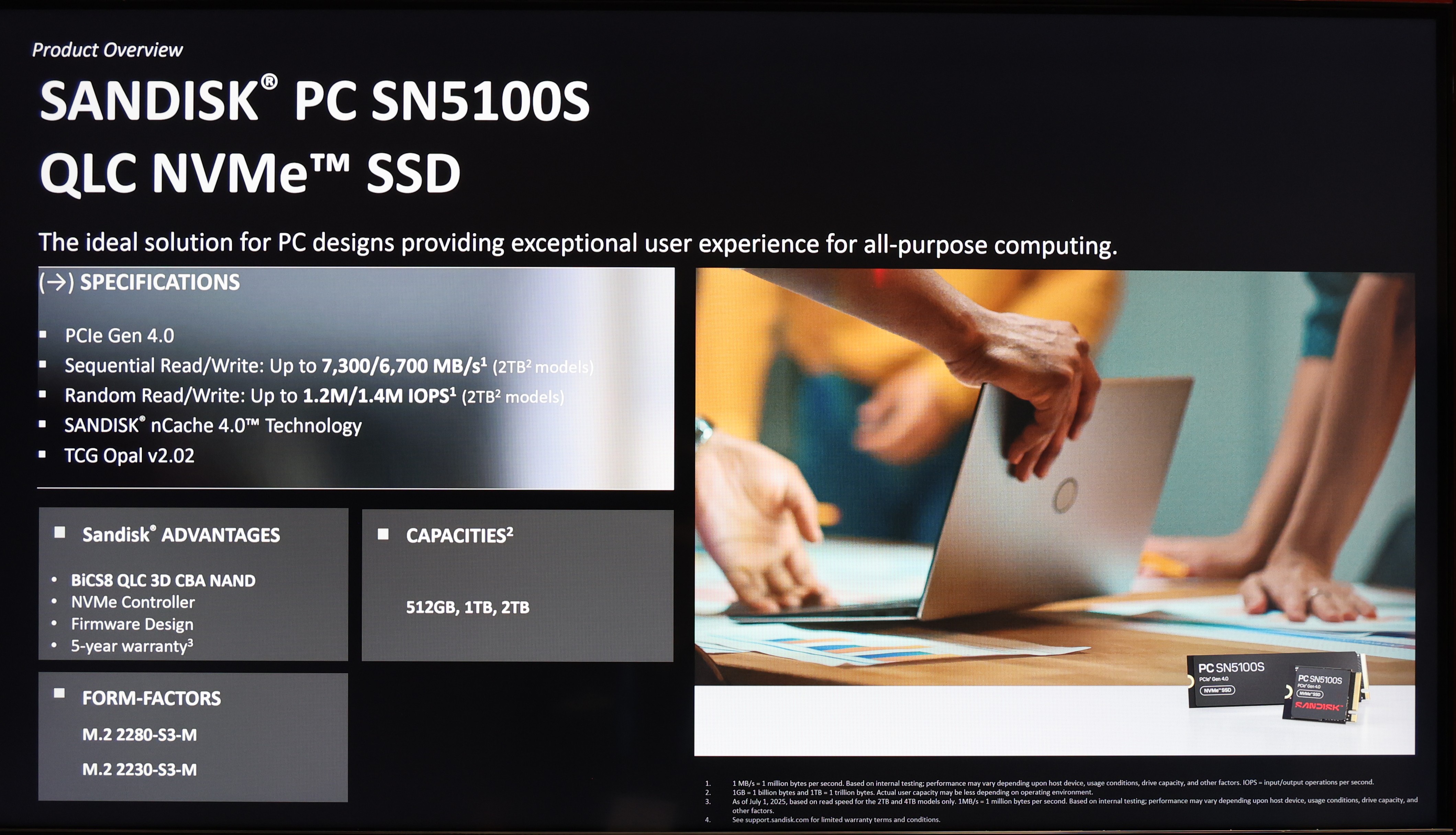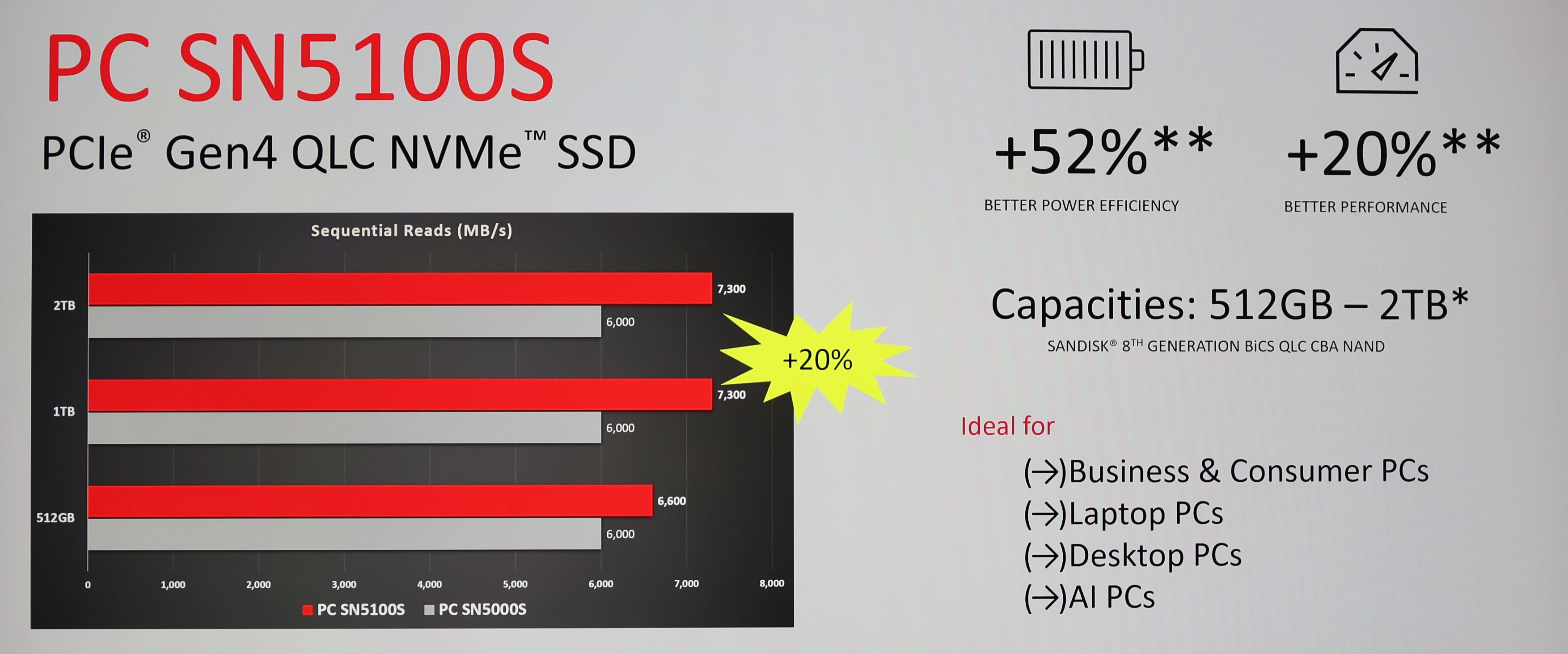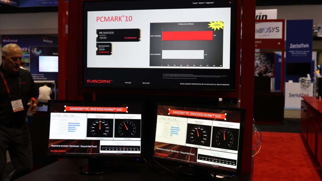 This morning at Flash Memory Summit 2025, we came across a new release by SanDisk identifies as the SN5100s client Gen4 SSD. Normally we might not take a second look at Gen 4 SSDs in this scenario, but this SSD brings to light a main theme at FMS this year…higher speeds with better power efficiency. This SSD will provide 7300MB/s speeds with a maximum draw of under 4 watts active and that is exciting news!