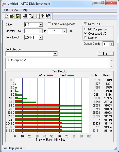 As we can see from the results above, ATTO reports max read speed of 91MB/s. And for write speed we see 63MB/s, exceeding the rated 60MB/s on the packaging.