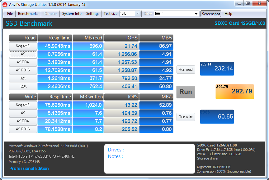 Anvil’s Storage Utilities is the best software program available for benchmarking flash media. Not only does it give an accurate look at transfer speeds and throughput, but also, it goes even further by identifying file sizes, disk access times, as well as system and device identification. It even has many extra features such as endurance torture testing and a TRIM button feature to manually trigger TRIM on supported devices.