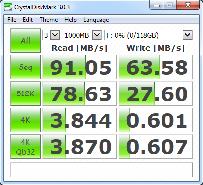 Crystal Disk Mark testing with its random data shows us the same speeds reported by ATTO. 91MB/s read and 63MB/s write.