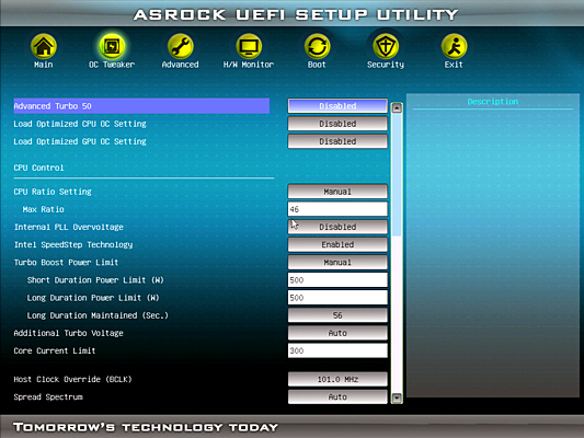 Novice overclockers can choose from a veriety of ASRock overclocking fail-safe profiles, which are listed in 200 MHz increments. Also, aside from XMP (Extreme Memory Profile), there is also a neat little ‘Advanced Turbo 50’ option that provides an instantaneous 50% overclock. This is more beneficial to older processors, as newer CPU’s generally come clocked at speeds extremely close to the safe-CPU BCLK limit: