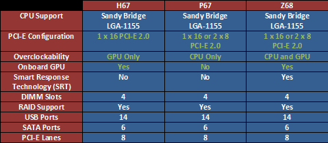 Here is a quick stat-sheet of the different chipsets and what they offer. As you can see, the Z68 chipset is identical to the P67 except only in two areas: