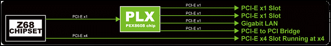 Compared with other Z68 chipset motherboards that bring limited PCI-E lanes, ASRock Z68 motherboards break the limitation and offer sufficient PCI-E lanes solution by embedding a PLX PEX8608 chip onboard. Users can simply enjoy all PCI-E devices.