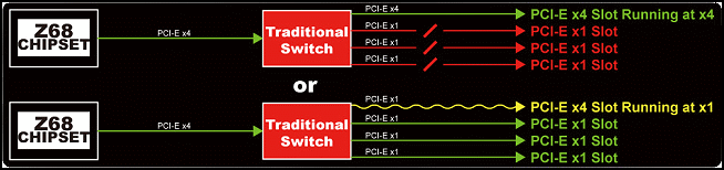 With traditional switch, if users want to run the PCI-E x4 slot at PCI-E, the other 3 PCI-E x1 slots cannot be used. If users install devices in any of the PCI-E x1 slot, then the PCI-E x4 slot will suffer to downgrade running at PCI-E x1.